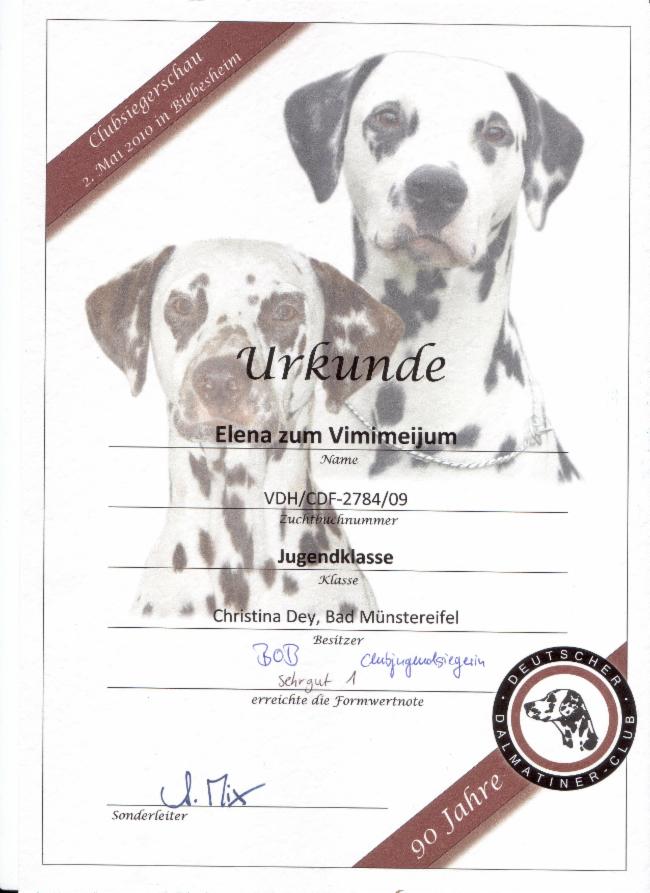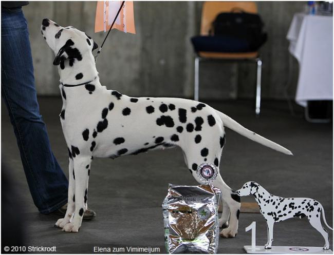 Elenas Richterbericht: 11 months, eye catching bitch, with a very dark black pigment, and dark spotting with a pure white, dark eyes, sweet temperament, complete and correct denture, very good proportions on the body, nice elegant mover