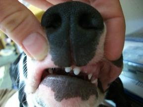 Es ist soweit! Elly hat bereits die ersten 5 Milchzähne (Schneidezähne) verloren und die neuen sind schon zu sehen! Viele weitere Schneidezähne und auch 2 Fangzähne wackeln bereits und werden sich wohl auch bald verabschieden. Das erklärt auch warum sie heute keinen Kauknochen essen wollte. Mit losen Zähnen ist der auch etwas schwierig zu essen!