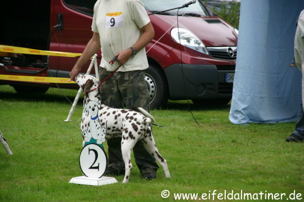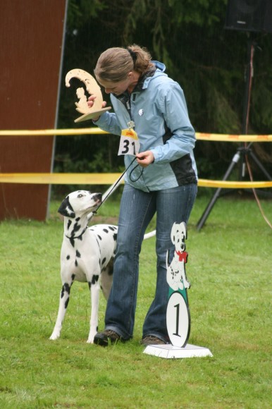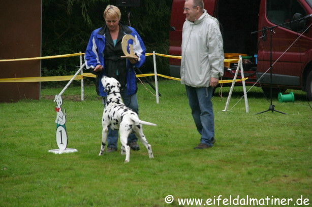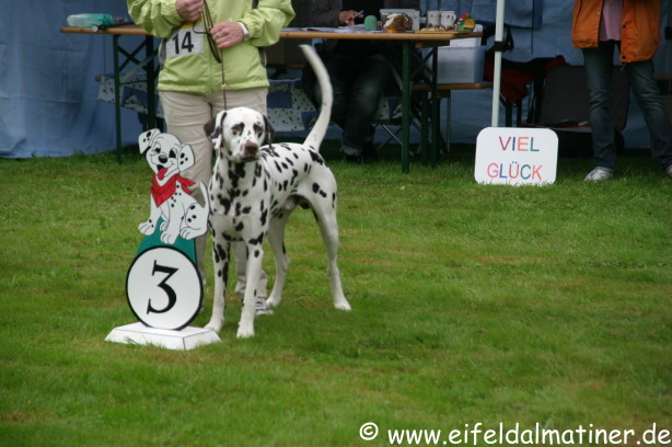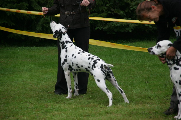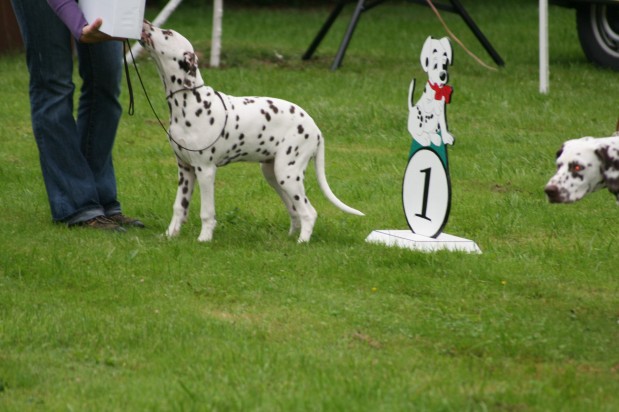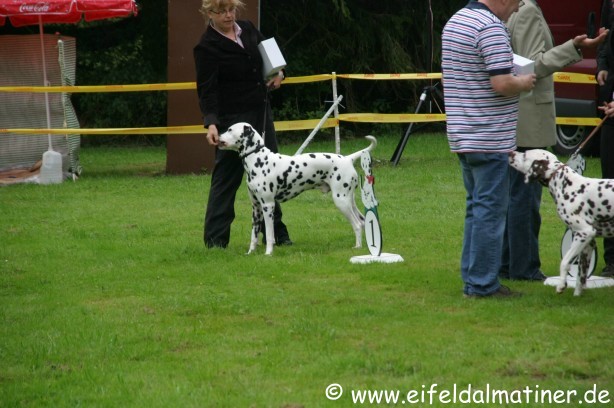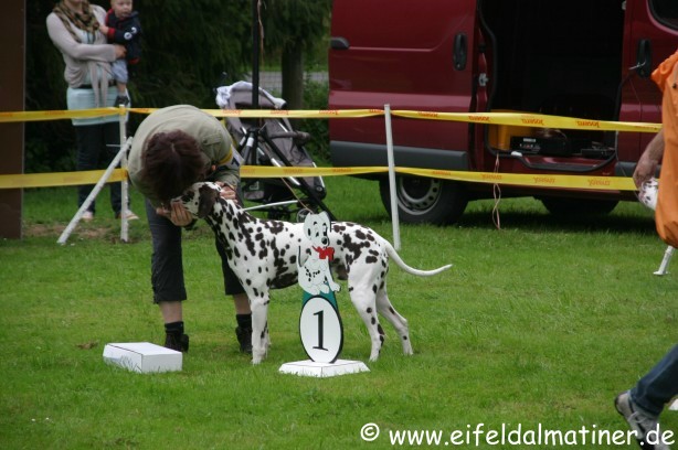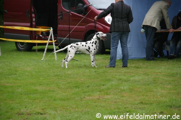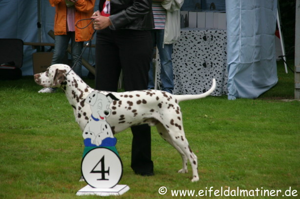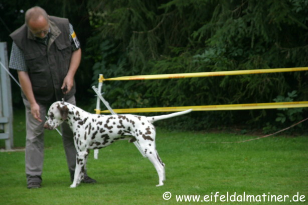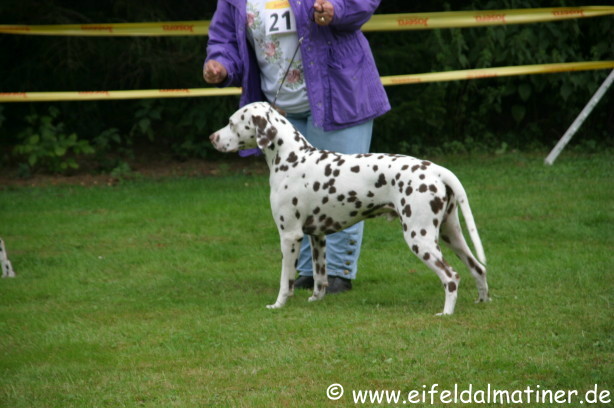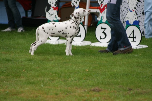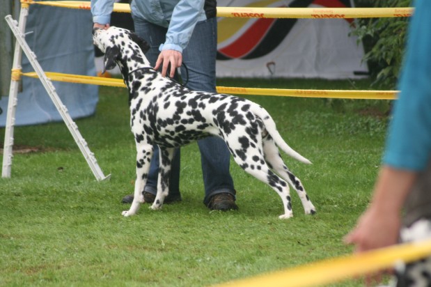 Richterbericht: 14 Monate, typvoll, kräftig weiß/schwarz getupfte Hündin, s.g. Kopfform, korrektes Ohr, Auge und Gebiss, s.g. Vor + HH, gute Knochen und Winkel, fest auf den Pfoten, kräftiger Körper von guter Länge, s.g. Obere- und Untere Linie, s.g. Kruppe + Rutenansatz, s.g. Bewegung