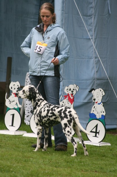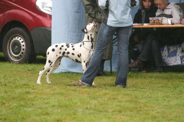 Richterbericht: 3 Jahre, elegante, typvolle Hündin, sehr stark schwarz getupft und zusammenlaufend, s.g. Kopfproportionen, korrektes Ohr, Auge + Gebiss, s.g. Vor- und Hinterhand, gen. starke Knochen, gute Winkel, fest auf den Pfoten, kraftvoller Körper von guter Länge, s.g. Ober/Untere Linie, korrekter Rücken + Rutenansatz