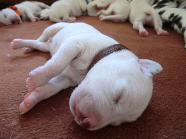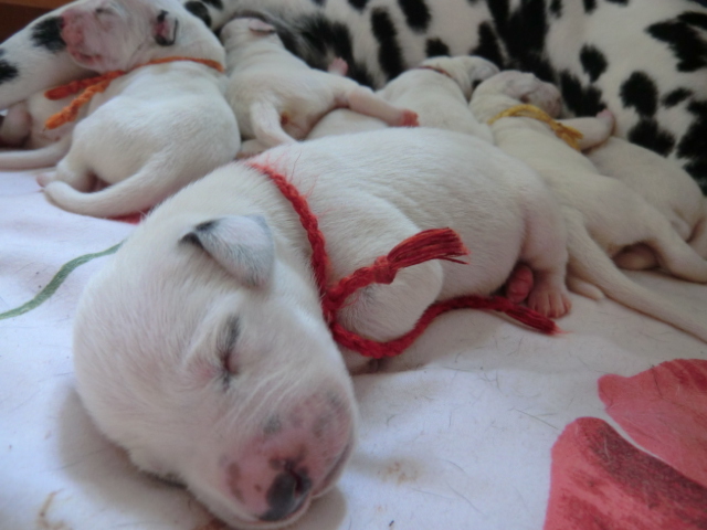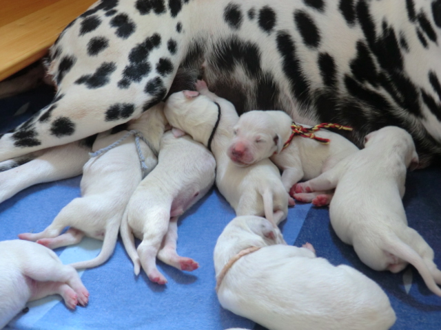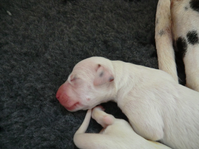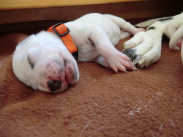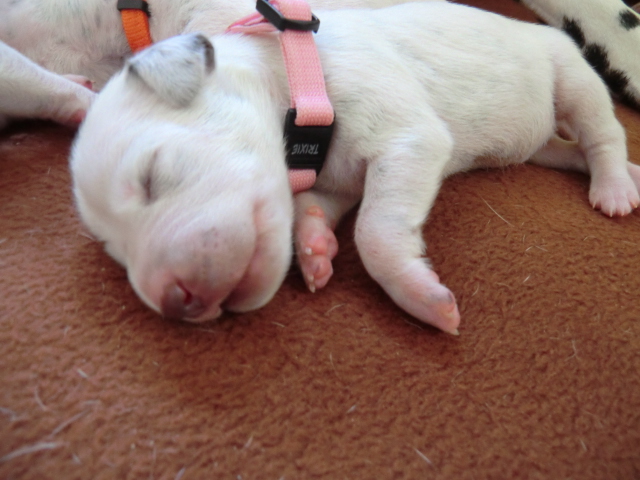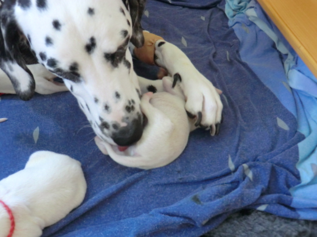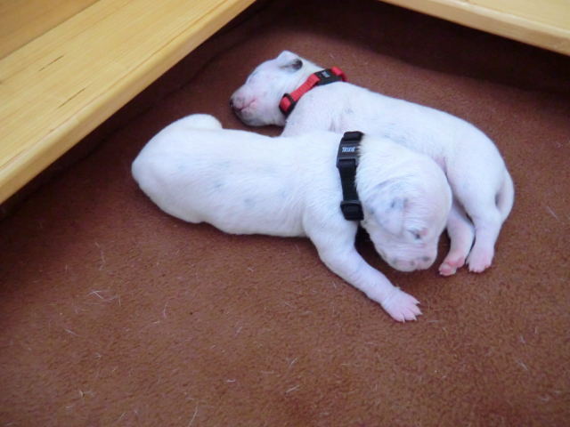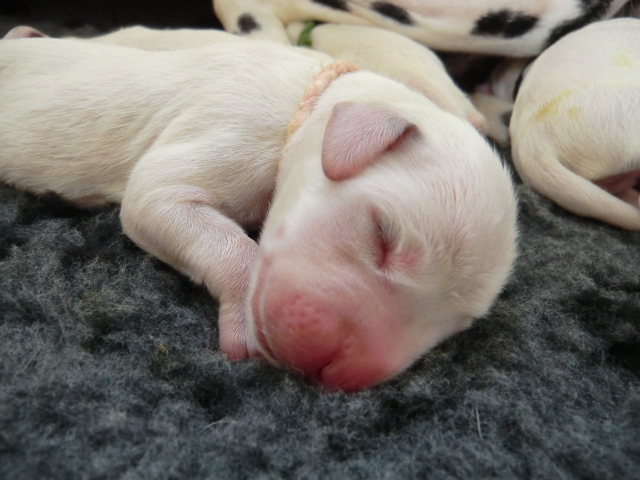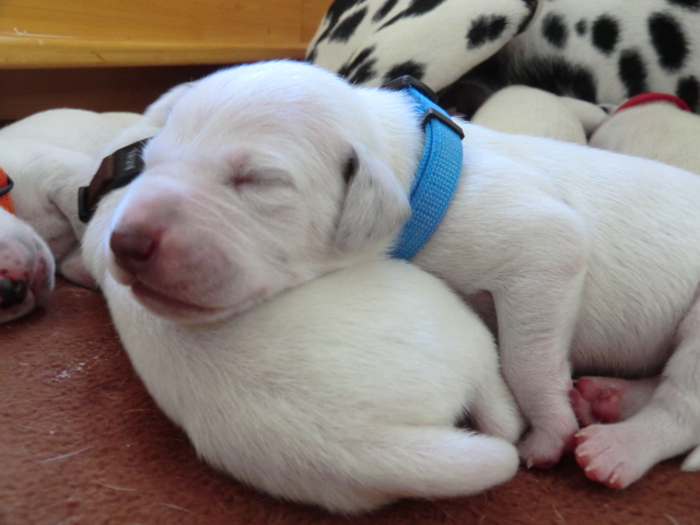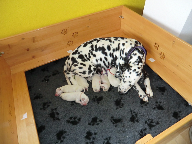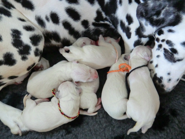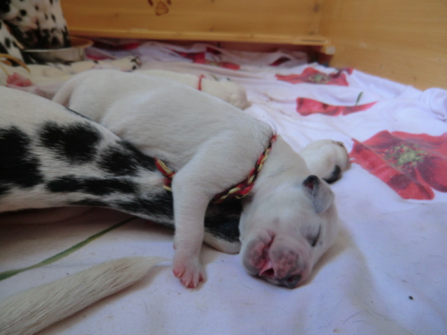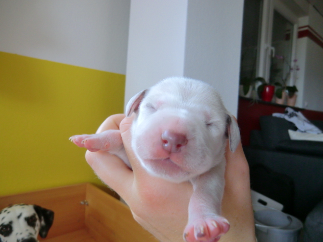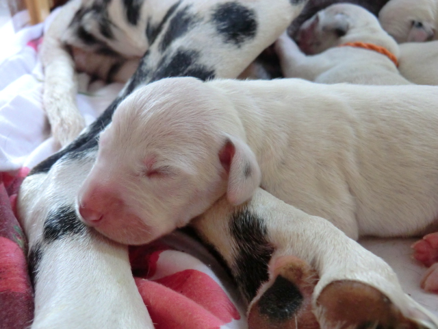 Jeden Tag entdecken wir etwas neues an den Zwergen! Da wird gegähnt, sich gestreckt und gereckt, erste wackelige schritte gemacht (vorher war es mehr ein Robben), es wird im Schlaf mit der Rute gewedelt, einige können auch schon ganz süß bellen und auch die Pünktchen sind von Tag zu Tag besser zu erkennen. Auch wenn das wohl jeder Züchter von seinen Welpen behauptet: Die Alina&Duki Babys sind wirklich ganz besonders hübsch und gelungen und ich bin davon überzeugt mit Duke eine spitzen Wahl getroffen zu haben und bin sehr auf die weitere Entwicklung der Fleckenzwerge gespannt. Viele haben sich bereits angemeldet um die kleinen in der 3. Lebenswoche das erste mal zu besuchen!