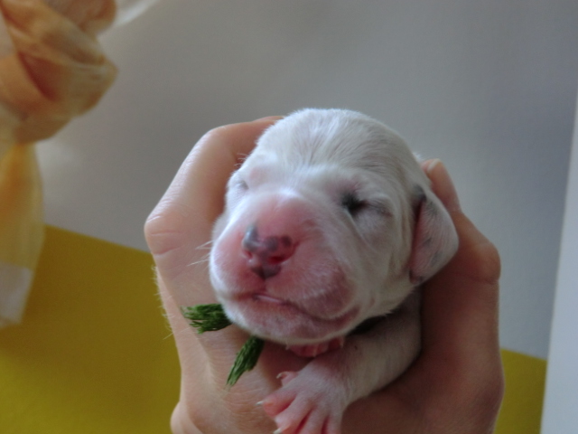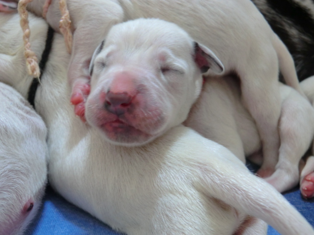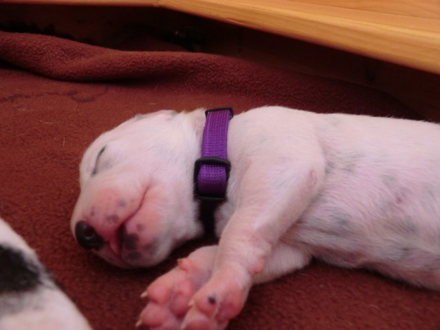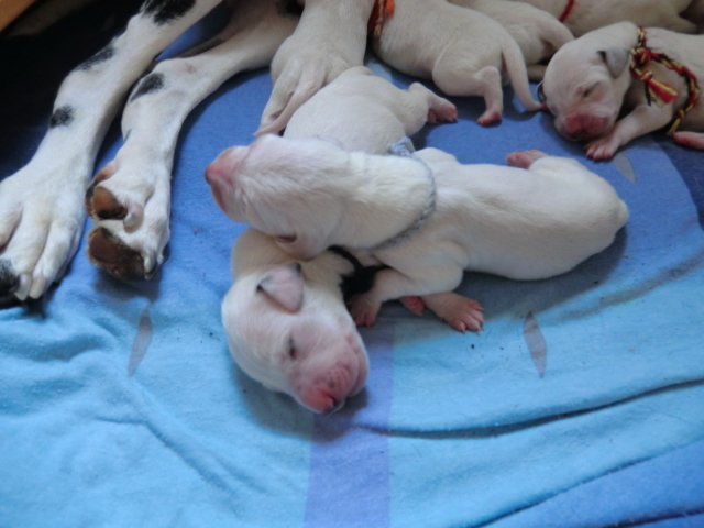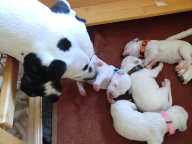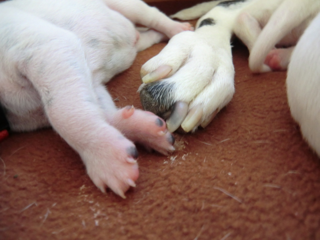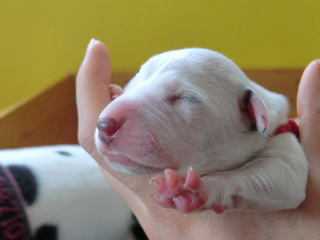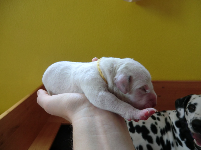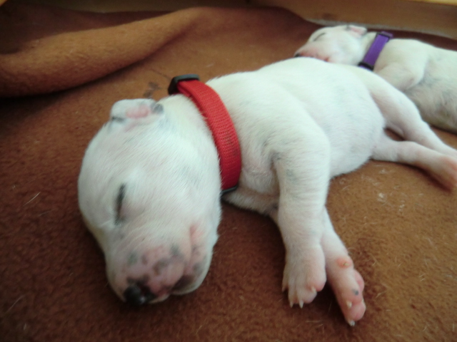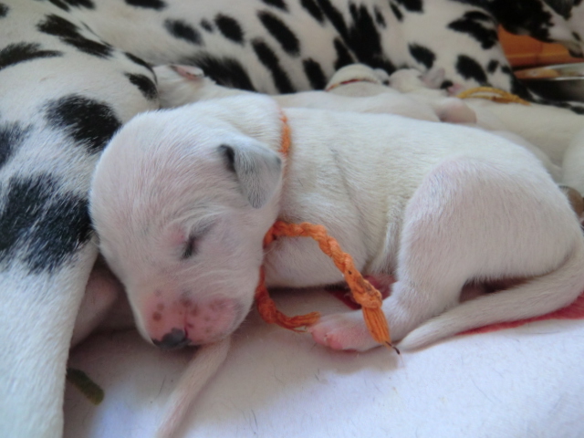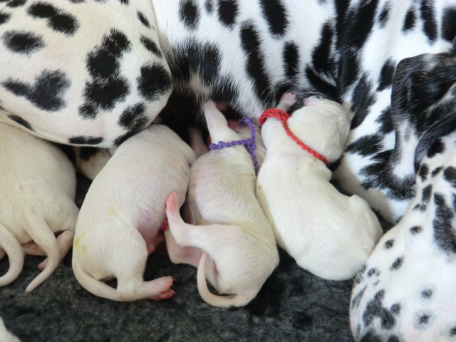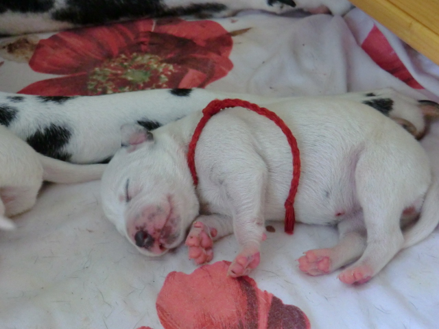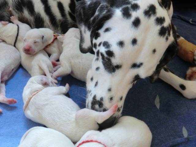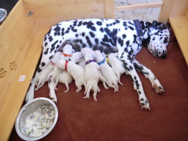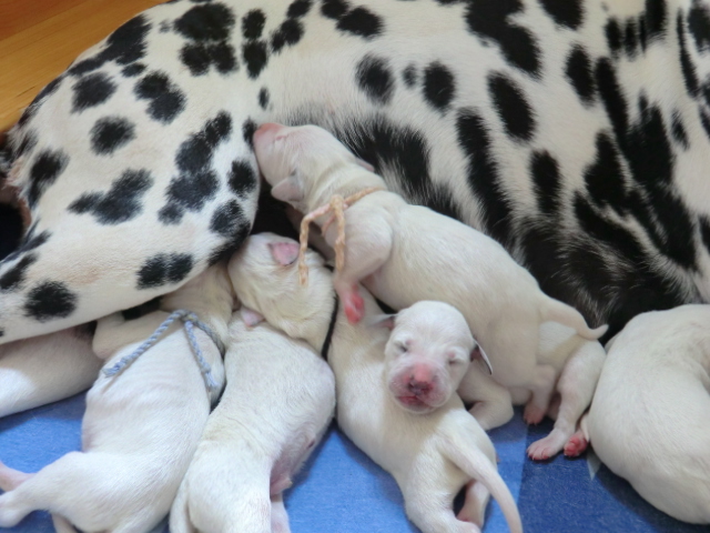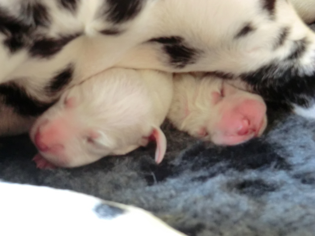 Jeden Tag entdecken wir etwas neues an den Zwergen! Da wird gegähnt, sich gestreckt und gereckt, erste wackelige schritte gemacht (vorher war es mehr ein Robben), es wird im Schlaf mit der Rute gewedelt, einige können auch schon ganz süß bellen und auch die Pünktchen sind von Tag zu Tag besser zu erkennen. Auch wenn das wohl jeder Züchter von seinen Welpen behauptet: Die Alina&Duki Babys sind wirklich ganz besonders hübsch und gelungen und ich bin davon überzeugt mit Duke eine spitzen Wahl getroffen zu haben und bin sehr auf die weitere Entwicklung der Fleckenzwerge gespannt. Viele haben sich bereits angemeldet um die kleinen in der 3. Lebenswoche das erste mal zu besuchen!