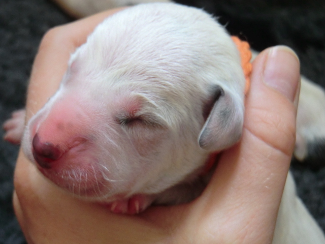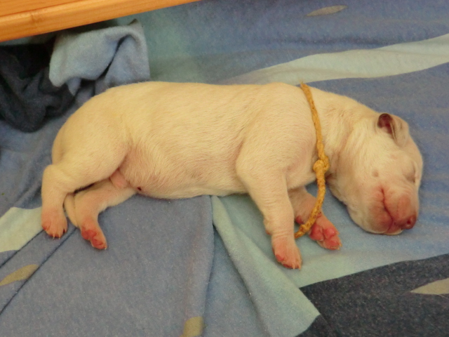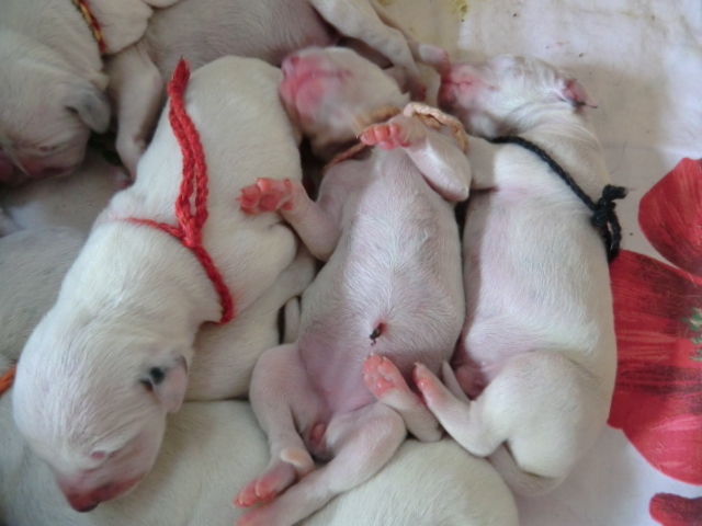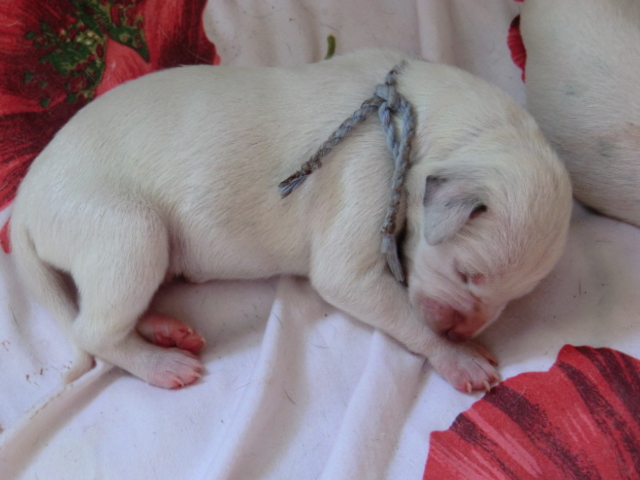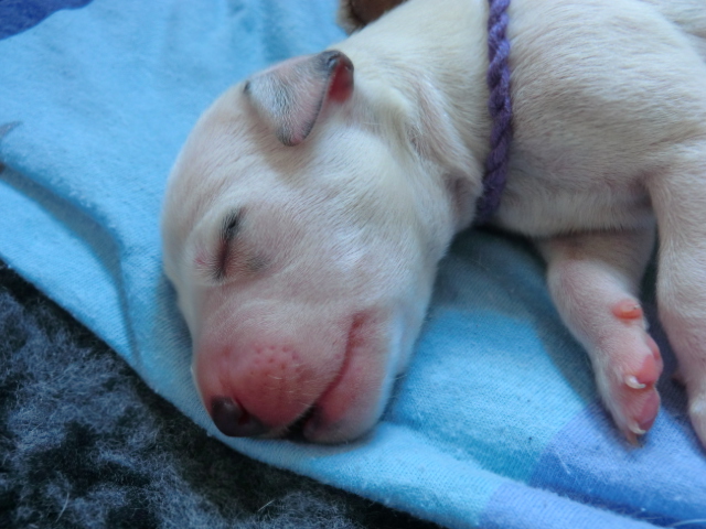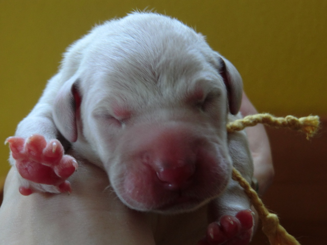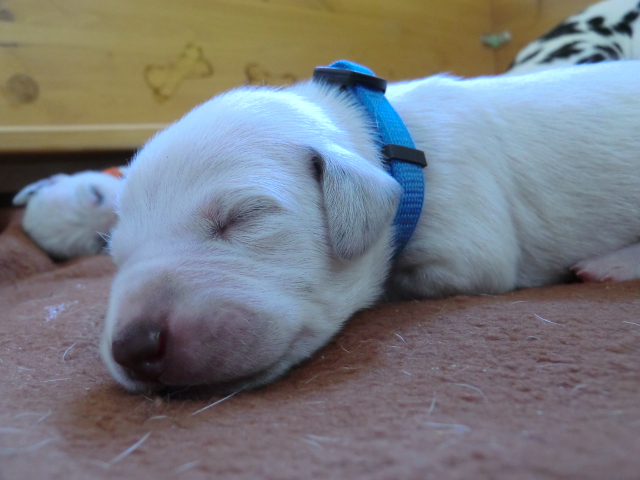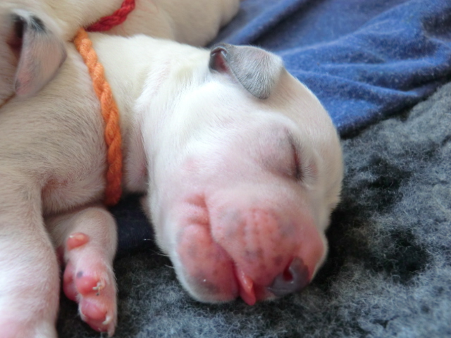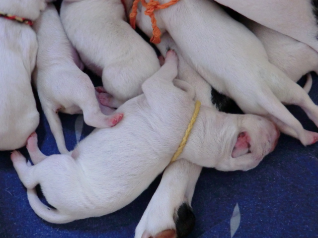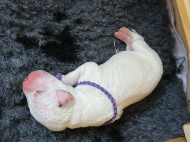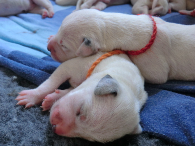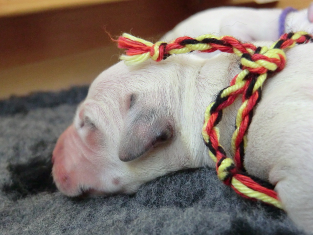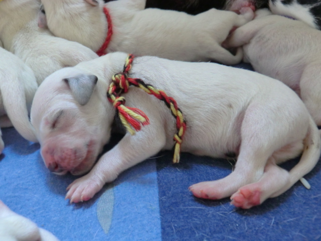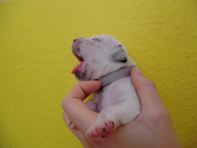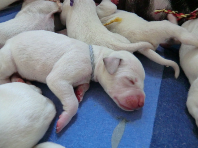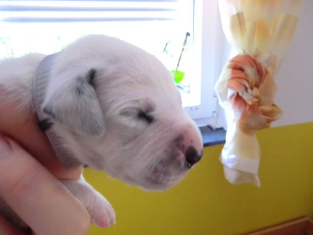 Gestern am 6. Tag wurden den kleinen das erste mal die mini Krallen geschnitten. Auf allen vieren hab ich mich an die Wurfkiste geschlichen in der die Welpen friedlich am schlafen waren. Die meisten haben es kaum bemerkt und wieder andere haben heftig protestiert! Jetzt schon kann man die verschiedenen Charakterzüge der kleinen erkennen. Viele sind absolut entspannt und gelassen, eben richtig "coole Socken" andere wiederum meckern schon mal gerne los wenn ihnen etwas nicht passt! Dann haben die Zwerge gestern auch ihre richtigen Welpenhalsbändchen anbekommen. Die passen nämlich bereits wie angegossen - bei den gut entwickelten Babys aber auch kein Wunder, aber seht selbst: