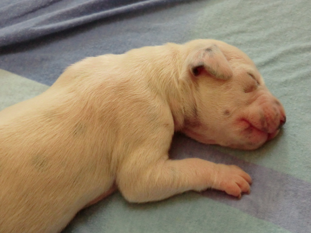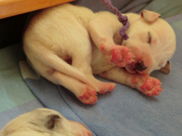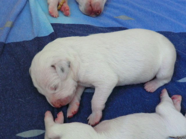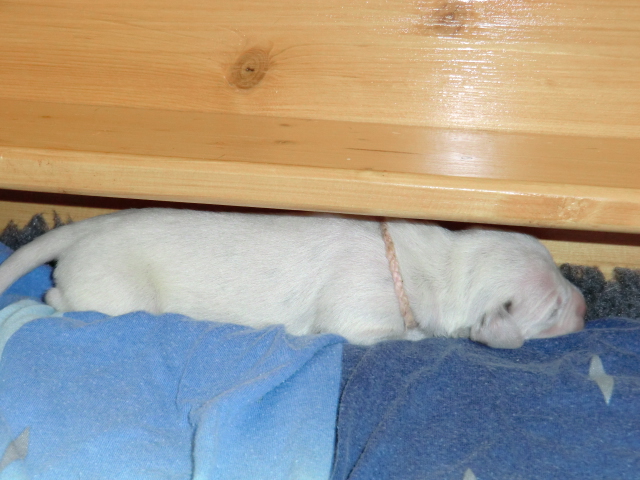 Schon wieder sind die Zwerge enorm gewachsen! Alle haben 600 Gramm überschritten - Herr Schwarz heute Morgen sogar 678 Gramm! Eine super Leistung von Alina, die sich wirklich sehr sehr gut um ihre Sprösslinge kümmert! Den ganzen Tag über werden sie von Alina umsorgt, gepflegt und geputzt. Alina verlässt jetzt auch schon mal öfters die Wurfkiste, geht kurz in den Garten oder legt sich auf die kühlenden Fliesen. Doch wenn ein Welpe quiekt, ist sie sofort zur Stelle um nach dem rechten zu sehen!