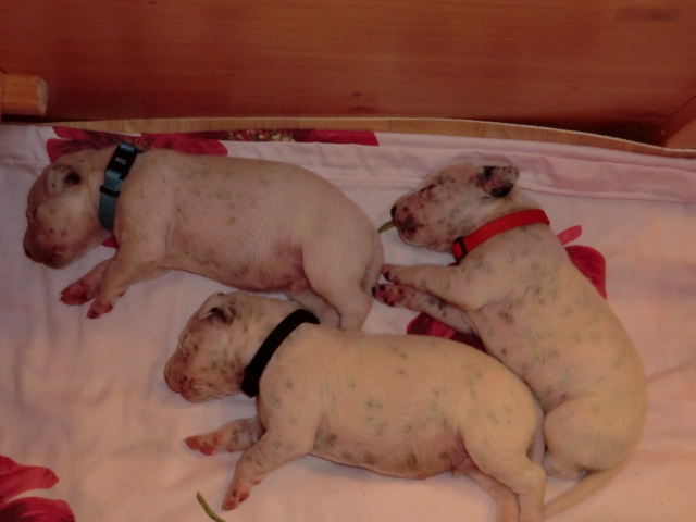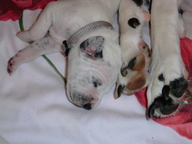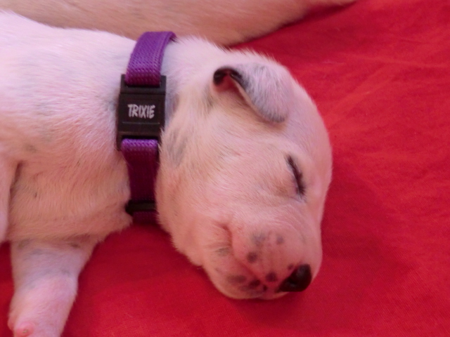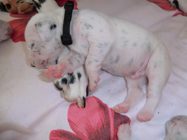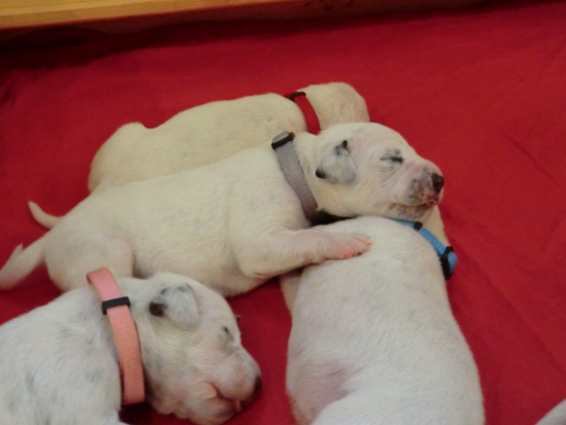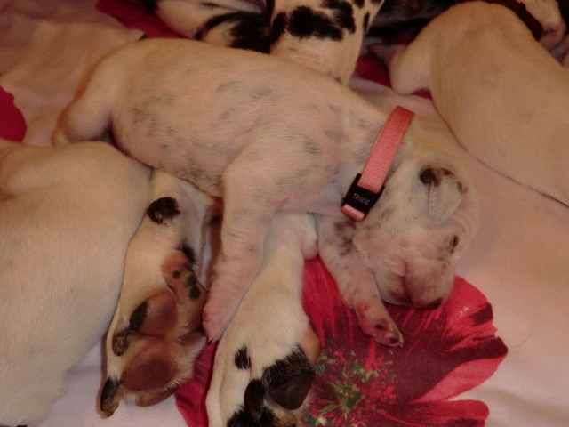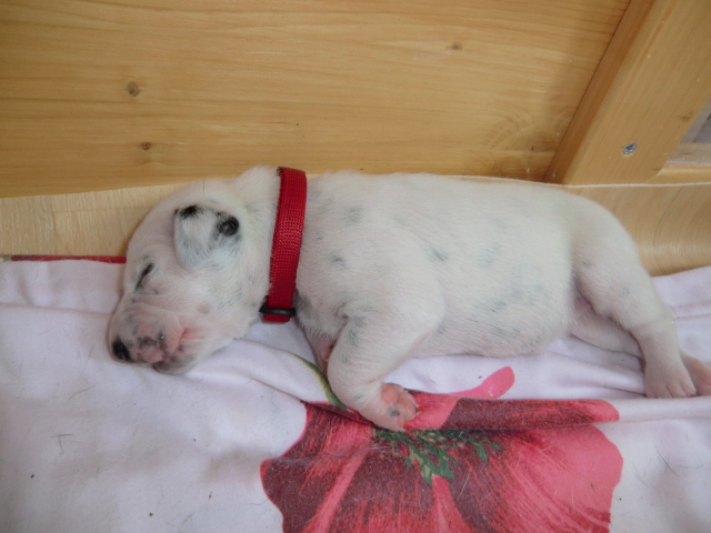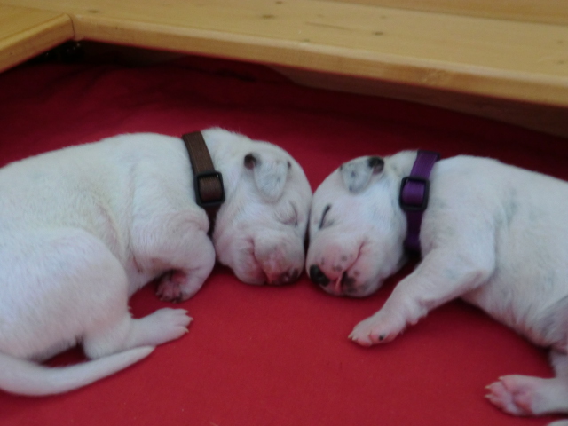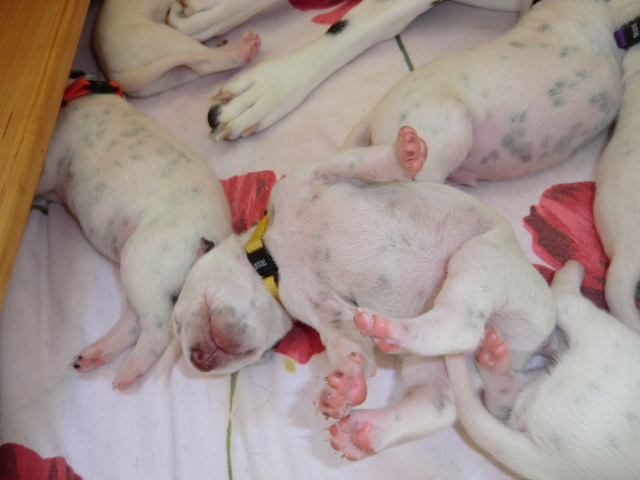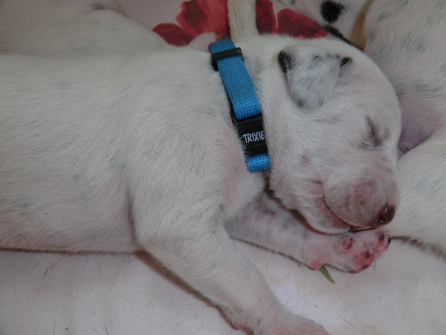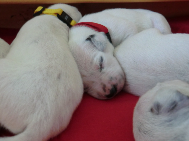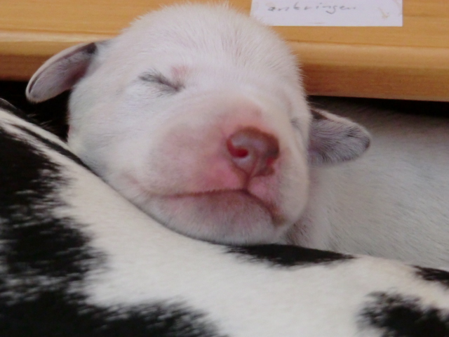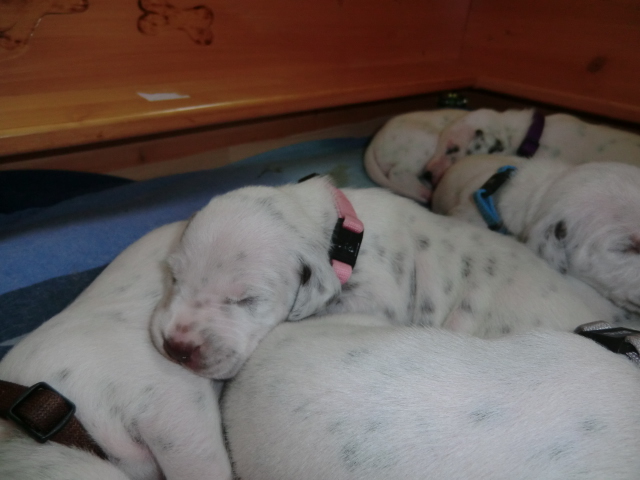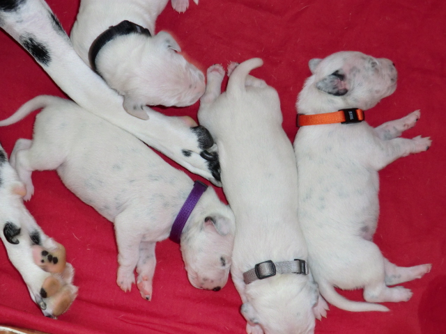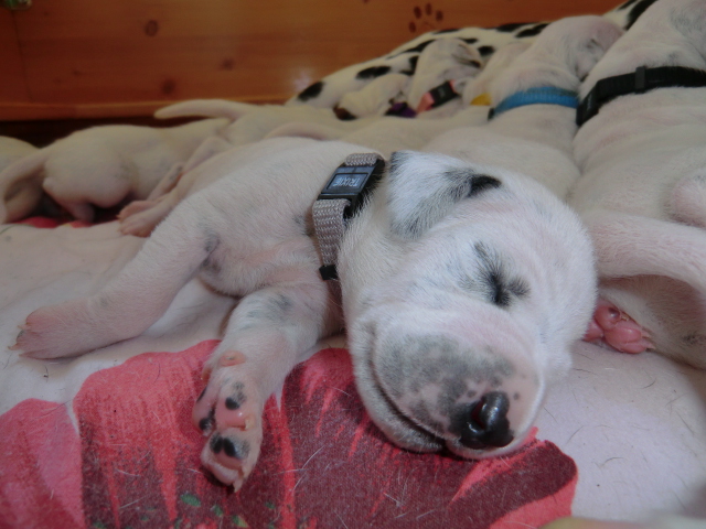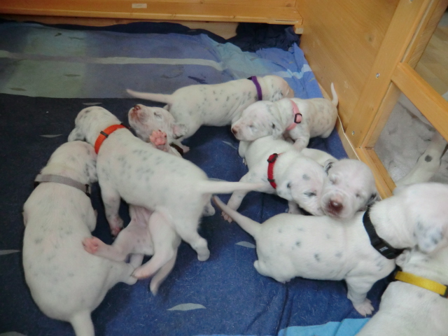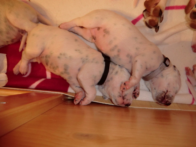 Mit der Entwicklung der Rasselbande bin ich absolut zufrieden und auch die Fleckung ist schon sehr gut zu sehen. Alle sind sehr gleichmäßig und fast alle sehr schön hell gefleckt. Ob weiß/braun oder weiß/schwarz, alle haben spitzen Pigmente! Ein überaus gelungener Wurf und ich bin doch ein bisschen stolz auf diesen ersten Wurf. Jetzt müssen nur noch die anderen Hürden genommen werden, doch bis dahin muss ich mich noch etwas gedulden!