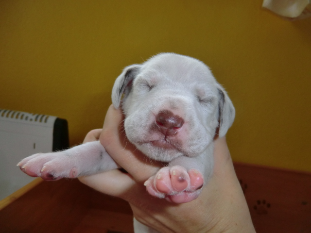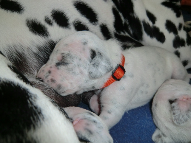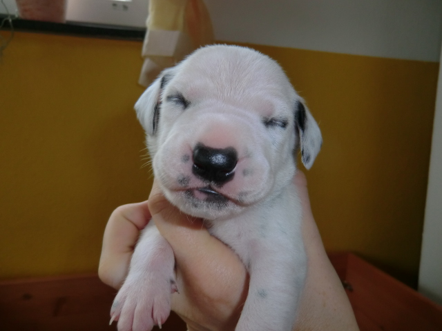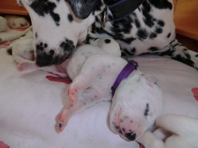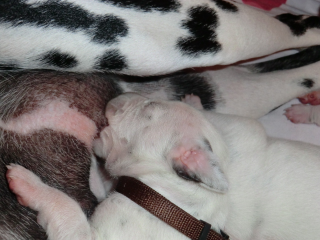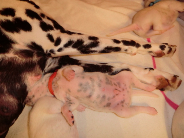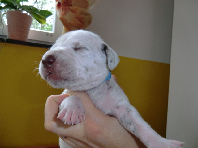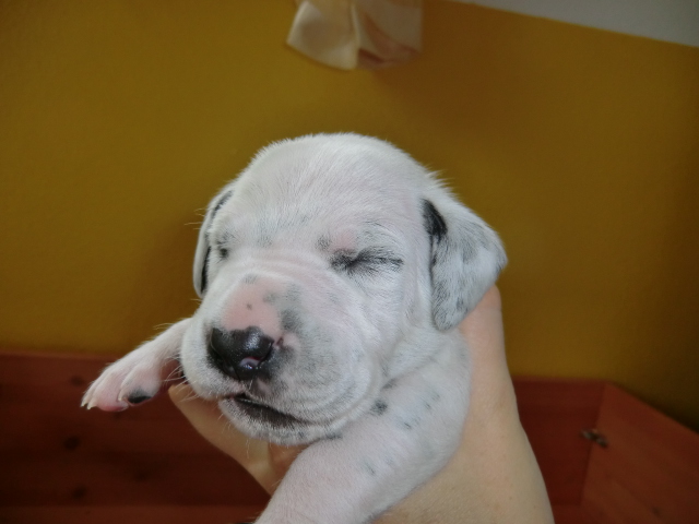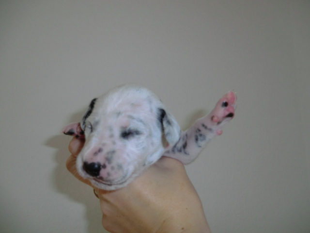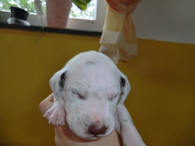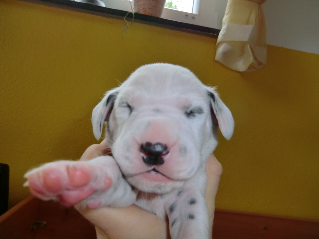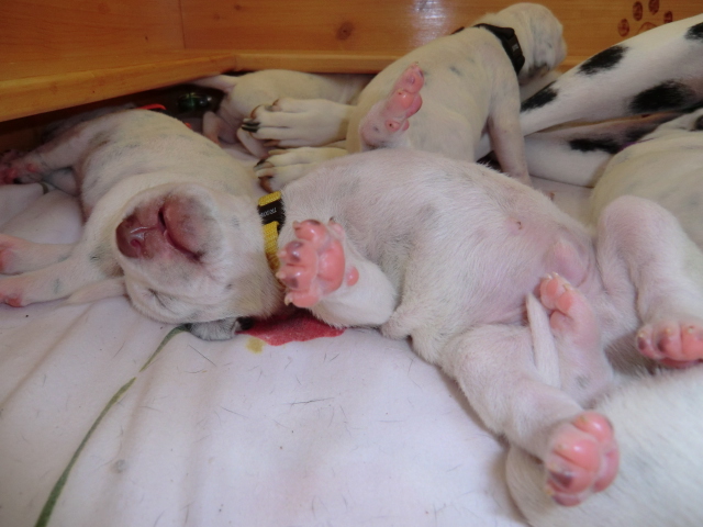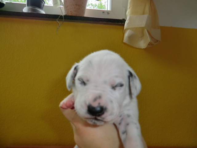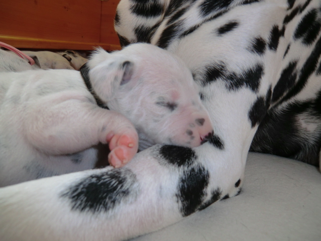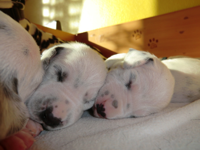 Heute in einer Woche kommen schon die ersten Besucher für die A-chen! Wie aufregend!! Nicht nur für uns und die Welpeninteressenten, die schon so lange auf diesen Tag warten, sondern auch für die Fleckenzwerge. Erste Kontakte haben sie natürlich schon zu ausgewählten Freunden und Familienangehörigen gemacht! Lustig ist zu beobachten das die Welpen Hände gleich als was positives betrachten, da wird dran gesaugt, genuckelt, etc. Eine Frühzeitige positive Prägung auf den Menschen ist enorm wichtig!!! In kürze werden die Welpen schon die Augen öffnen! Ein absolutes Highlight, worauf schon ganz gespannt gewartet wird!!!