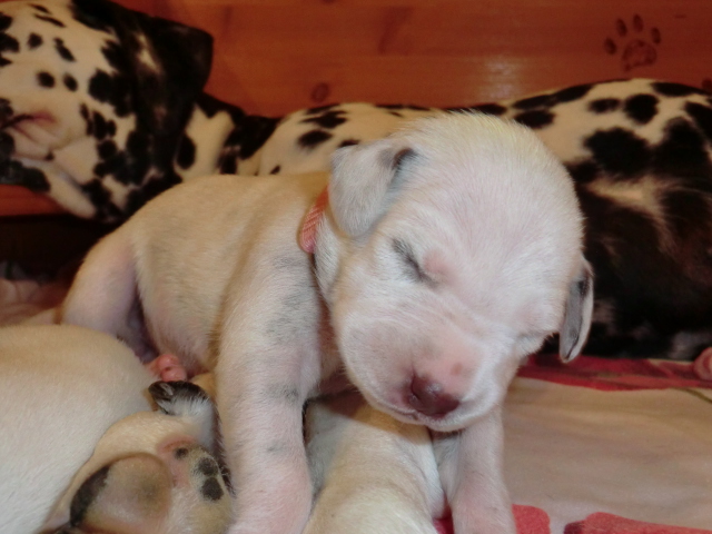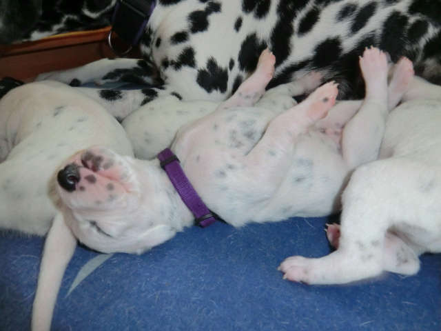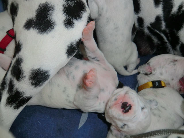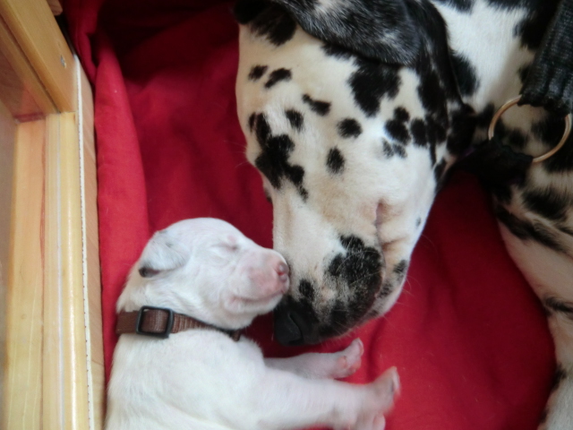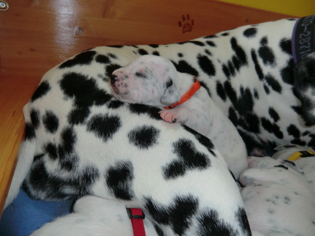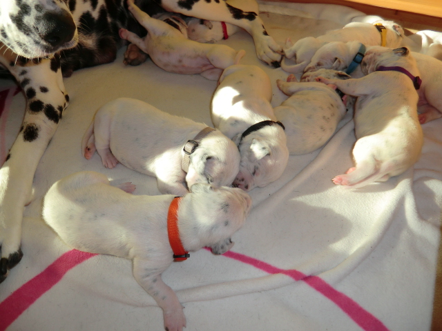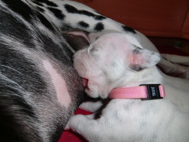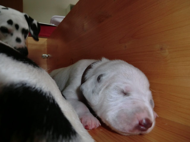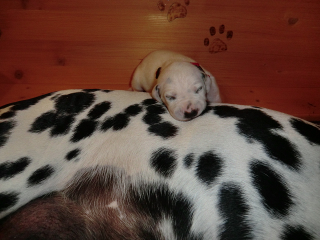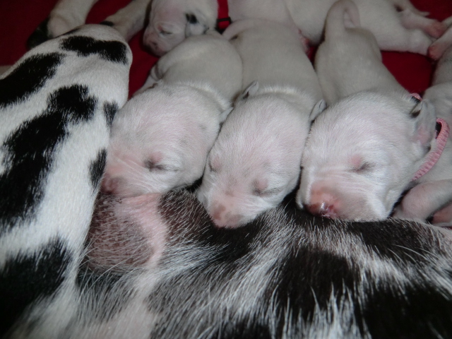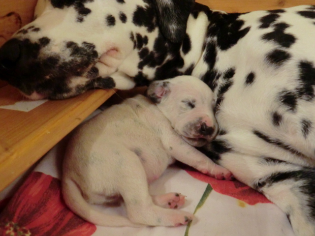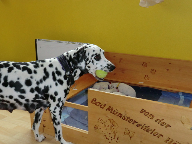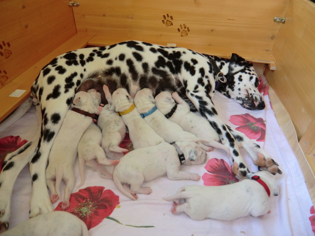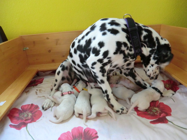 Also dann, warten wir mal wann uns der erste Welpe mit – hoffentlich – dunklen Augen anschaut! Dann gibt es auch neue Fotos von der Fleckenbande!!
