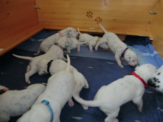 So langsam ist richtig Leben in der Wurfkiste und die Fleckenzwerge laufen schon richtig rum!