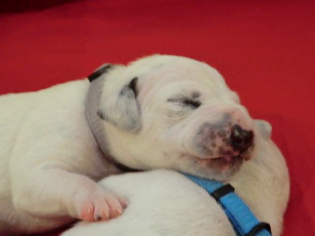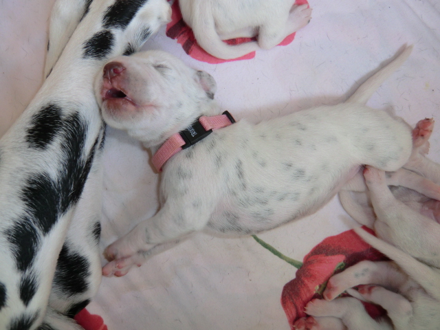 Noch immer werden die Welpen zwei mal täglich gewogen (Morgens und Abends) um eventuelle Auffälligkeiten sofort zu erkennen. Bisher sind aber alle neune rund, gesund und fleißig am zunehmen, und damit das auch so bleibt wird weiterhin alles streng dokumentiert und kontrolliert! Die Fleckung wird immer deutlicher, und so langsam kann man alle auch schon ohne Bändchen unterscheiden. Heute gibt es dann für alle Welpen die erste Wurmkur. Alina & Elena werden natürlich auch gleichzeitig mit entwurmt.