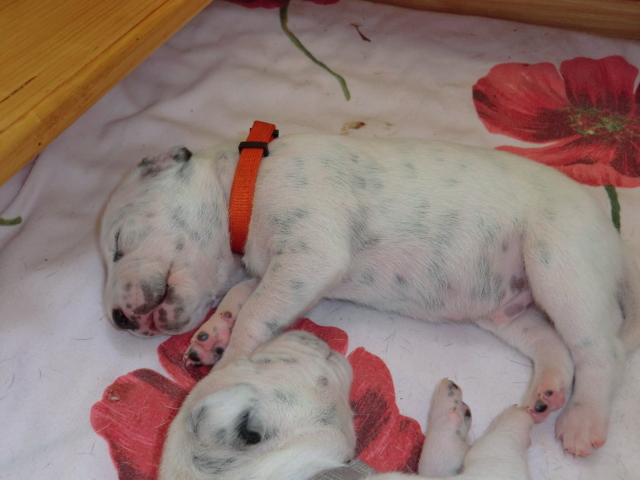 Herr Orange ist weiß/schwarz gefleckt. Er ist der einzige der bei der Fleckenverteilung etwas lauter Hier gebellt hat. Ein richtig hübscher kleiner Rüde mit viel Pigment!