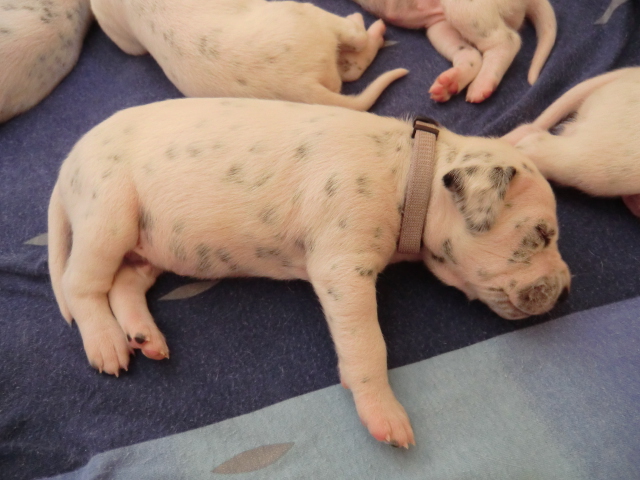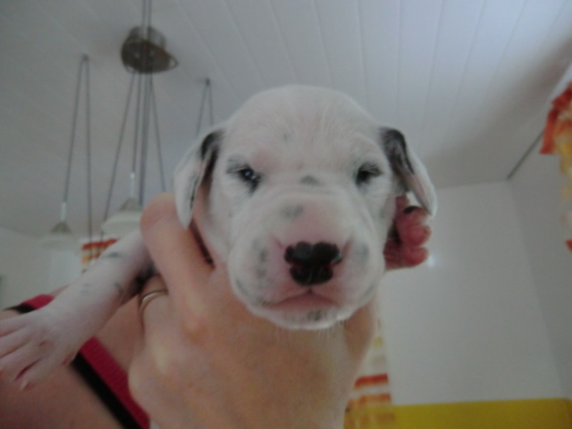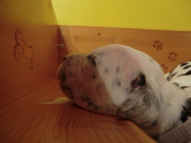 Schon wieder ist eine Woche rum und die A-chen starten heute bereits die 3. Woche! Die Augen der kleinen öffnen sich immer mehr. Viele sehen zur Zeit total witzig aus. Bei manchen ist schon ein Auge ganz auf, das andere dann nur so halb. Alle Äuglein die sich bisher bei den weiß/schwarz gefleckten zeigten sind funkelnd schwarz, bisher keine Blauen Augen in Sicht! Bei unseren Brownies wird man das ja erst etwas später mit Gewissheit sagen können, da die weiß/braun gefleckten Dalmis ja generell meist etwas hellere Augen haben als die weiß/schwarz gefleckten.